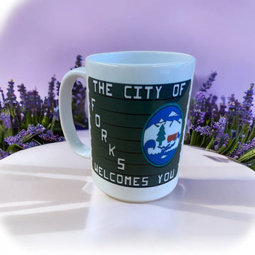Now you can have your very own mug with the Forks Welcomes You Sign on...