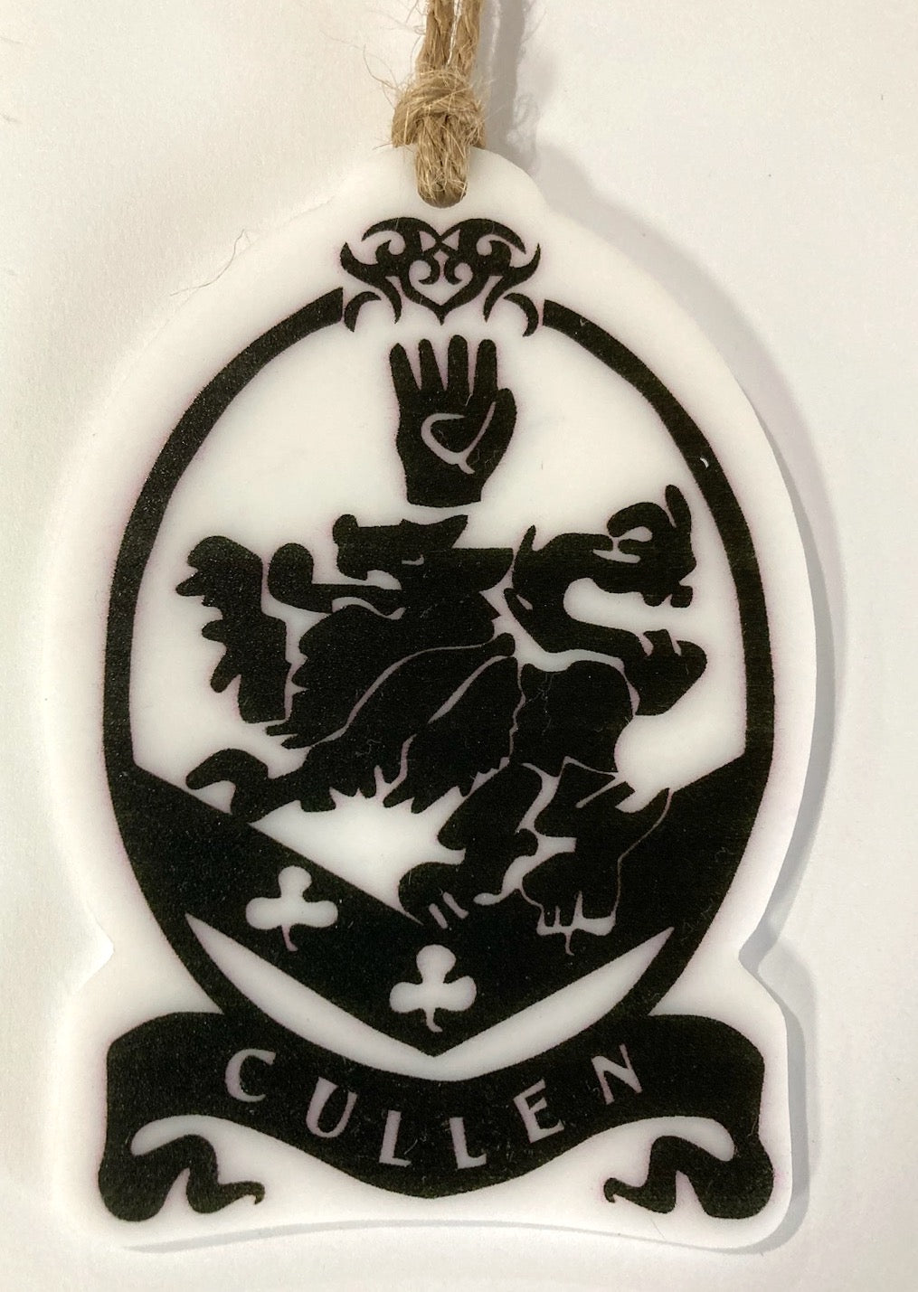 If you've ever secretly longed to be part of the Cullen clan, you're not alone! Fiercely loyal, supportive, ethical, highly cultured, stunningly attractive...the Cullens represent an ideal family group for many Twilight fans. Show your support for Team Cullen with this Cullen Crest design. It is now available as a small sign/ornament or a magnet, so you can hang it on your Christmas tree or your vehicle rear view mirror or place it on your refrigerator. Whichever you choose, it's a great way to keep the memory of some of your favorite character alive.