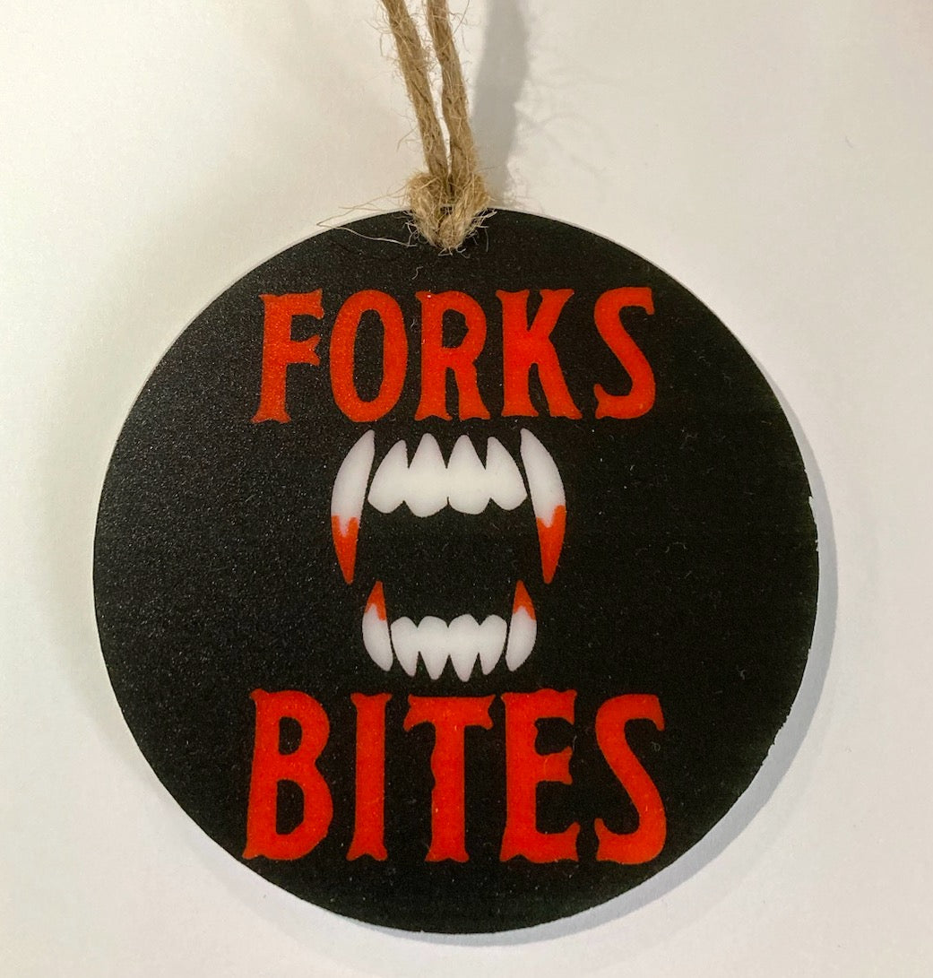 Here's a funny image of stylized teeth that will bring a laugh to any Twilight fan. "Forks Bites," it reads. It is now available as a small sign/ornament or a magnet, so you can hang it on your Christmas tree or your vehicle rear view mirror or place it on your refrigerator. Whichever you choose, it's a good way to remind you of the small and cheerful town of Forks, the setting of the Twilight books and films.