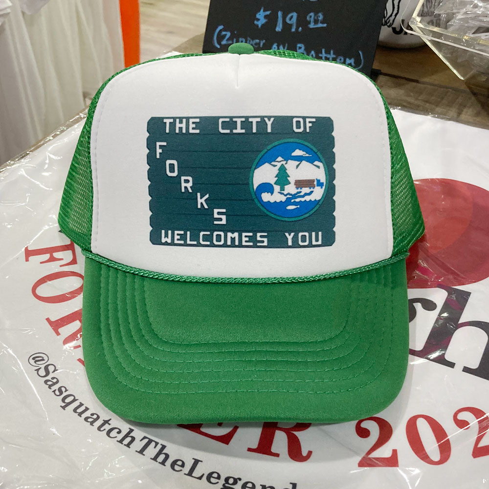 Forks Welcomes You Trucker Hat. Printed and shipped from Forks WA
