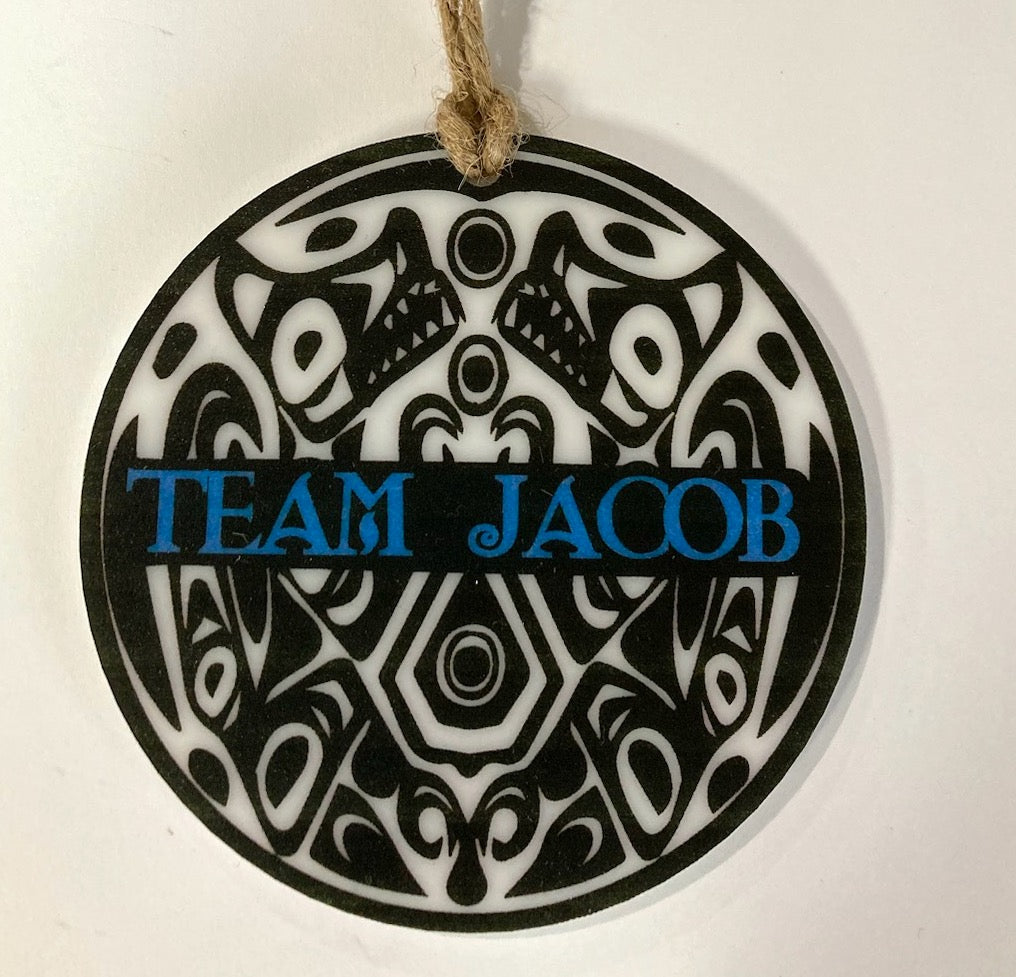 There are those who say Jacob is the real hero of Twilight...and who are we to say they're wrong? Show your support for Team Jacob with this bold design. It is now available as a small sign/ornament or a magnet, so you can hang it on your Christmas tree or your vehicle rear view mirror or place it on your refrigerator. Whichever you choose, it's a great way to keep the memory of a favorite character alive.